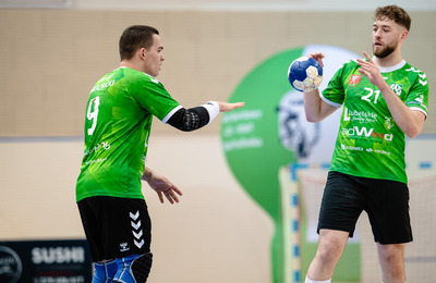 Kilka minut później mieliśmy już zaliczkę dwóch trafień (9:7), a przyczyniły się do tego dwie bramki Marcina Stefańca i skuteczny rzut Kamila Kozycza. Takie proporcje bramkowe utrzymały się niemal do końca pierwszej połowy. Po stronie „biało-zielonych” bramki zdobywali: Filip Lewalski (trzy, w tym dwie z rzutów karnych), Daniel Szendzielorz, Kamil Kozycz i Franciszek Wierzbicki. Tuż przed upływem czasu pierwszej odsłony meczu trafili jeszcze młodzi zawodnicy z Kielc i do szatni schodziliśmy przy prowadzeniu 15:14.
