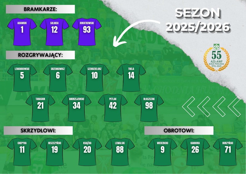 Zawodnicy od kilku tygodni szlifują formę na wspólnych treningach, a koszulki piłkarzy ręcznych AKPR AZS AWF Biała Podlaska powoli zapełniają się logotypami naszych Sponsorów. Z jakimi numerami zagrają nasi szczypiorniści w sezonie 2025/2026? Poniżej publikujemy grafikę z nazwiskami i numerami, z jakimi Akademicy występować będą w rozgrywkach Ligi Centralnej i Pucharze Polski.