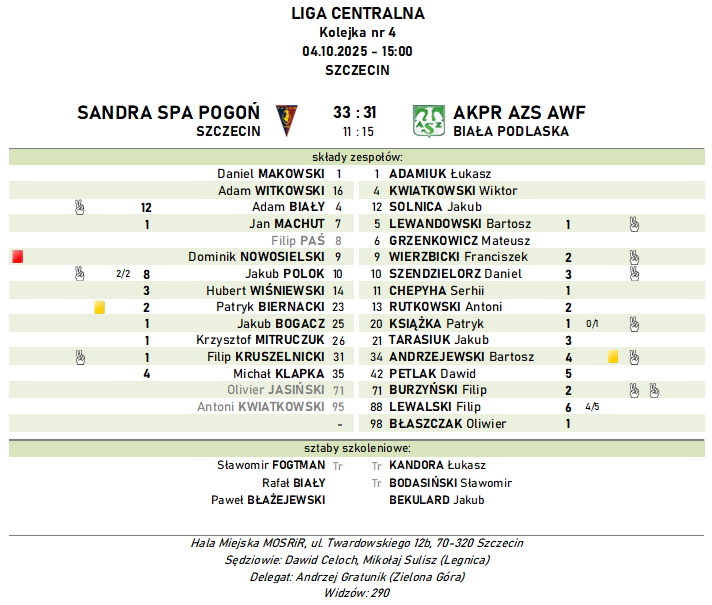 W ramach 4. kolejki rozgrywek Ligi Centralnej mężczyzn piłkarze ręczni AKPR AZS AWF Biała Podlaska udali się do Szczecina na mecz z Sandrą Spa Pogonią. Początek tych zawodów miał wyrównany przebieg z lekką przewagą gości. Po 5. minutach gry Akademicy prowadzili 3:2. Dwie bramki dla bialskiego zespołu zdobył Filip Lewalski (w tym jedna z rzutu karnego), a na kole z dobrego ustawienia skorzystał Filip Burzyński. W 10. minucie był remis (5:5), a akcje "biało-zielonych" z powodzeniem wykończyli: Bartosz Andrzejewski i Oliwier Błaszczak. Po tym czasie równowaga bramkowa zniknęła z tablicy wyników na bardzo długi okres czasu. Dobra gra w defensywie, poparta całą serią bramkarskich interwencji Wiktora Kwiatkowskiego sprawiła, że to nasz zespół przejął inicjatywę i pełną kontrolę nad wydarzeniami w szczecińskiej hali.