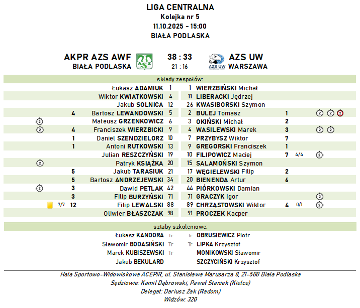 W sobotnie popołudnie do rywalizacji o ligowe punkty stanęły dwa akademickie zespoły. AKPR AZS AWF Biała Podlaska podejmował AZS UW Warszawa. Mecz odbył się w ramach 5. kolejki Ligi Centralnej mężczyzn. Zawody rozpoczęli goście i to oni szybko znaleźli sposób, aby objąć prowadzenie. Na rewanż ze strony bialskiego zespół nie czekaliśmy zbyt długo. Dynamiczna akcja w wykonaniu Dawida Petlaka zakończyła się faulem rywali i rzutem karnym, którego na bramkę zamienił Filip Lewalski. W drugiej minucie szczypiorniści z Warszawy ponownie mieli jedną bramkę więcej. Tym razem o wyrównanie osobiście zadbał Dawid Petlak, a następnie trafienie na 3:2 rzutem z koła zaliczył Filip Burzyński.
