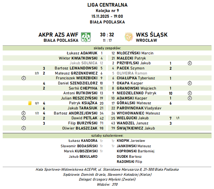 Ekipa z Wrocławia robiła co mogła, aby wywieźć trzy punkty z Białej Podlaskiej. Przybliżyli się do tego na początku 57. minuty, gdy tablica wyników wskazywała stan 28:30. Bramkę kontaktową zdobył z rzutu karnego Bartosz Andrzejewski, ale minutę później ta sztuka już się nie udała naszemu rozgrywającemu i Śląsk "odskoczył" na 29:32. W ostatnich sekundach piłkę w bramce rywali ulokował jeszcze Bartosz Lewandowski, ale ostatecznie z wygranej cieszyli się goście.