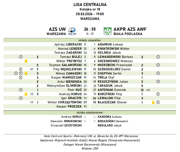 Jeszcze lepiej wyglądał rezultat w 45. minucie, gdy ekipa z Białej Podlaskiej miała już siedem bramek zaliczki (26:19). Kolejne dwa udane rzuty oddał Dominik Antoniak (w tym raz z zrzutu karnego), dwukrotnie defensywę AZS-u UW ograł Jakub Tarasiuk, a po jednej bramce zdobyli także: Bartosz Lewandowski i Filip Burzyński.