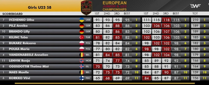Dwa kilogramy więcej w dwuboju uzyskała inna z reprezentantek Polski, Roksana Bukarz (LKS Budowlani Kucera Nowy Tomyśl) - 5. miejsce w dwuboju i brązowy medal za rwanie. Bezkonkurencyjna była Olha Ivzhenko. Reprezentantka Ukrainy "zgarnęła" komplet złotych medali uzyskując 210 kg w dwuboju (95 kg + 115 kg). Pozostałe medale przypadły w udziale zawodniczkom zza naszej zachodniej granicy. Druga w dwuboju była Annika Pilz, a trzecie miejsce wywalczyła Lilly Brando.