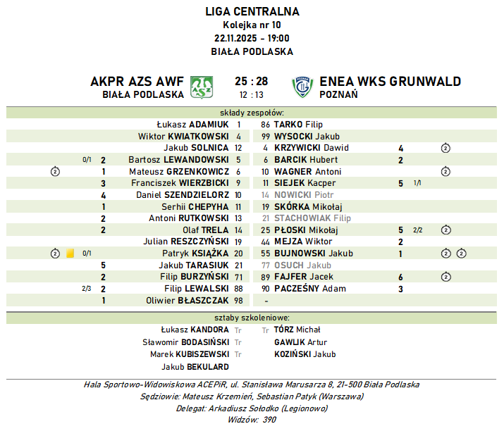 Rozgrywki Ligi Centralnej mężczyzn w sezonie 2025/2026 powoli zmierzają do półmetka. W miniony weekend rozegrano 10. kolejkę spotkań, a w niej AKPR AZS AWF Biała Podlaska podejmował zespół Enea WKS Grunwald Poznań. "Biało-zieloni" przystąpili do tej rywalizacji bez kontuzjowanych: Bartosza Andrzejewskiego i Dawida Petlaka.