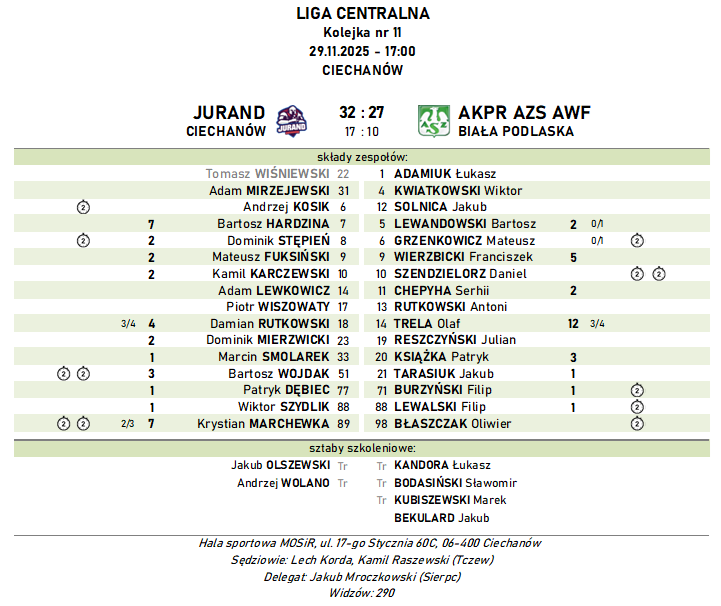 W 11. kolejce rozgrywek Ligi Centralnej mężczyzn, piłkarze ręczni AKPR AZS AWF Biała Podlaska udali się do Ciechanowa, gdzie zmierzyli się z czołową ekipą rozgrywek, Jurandem. Rywalizację zdecydowanie lepiej rozpoczęli gospodarze. Na pierwszą bramkę AZS-u przyszło nam czekać do 6. minuty (premierowe trafienie należało do Bartosza Lewandowskiego), ale zanim do tego doszło przegrywaliśmy już 0:2. Wynik mógł wyglądać zdecydowanie lepiej, ale fiaskiem zakończyły się dwa podejścia naszych zawodników do rzutów karnych.