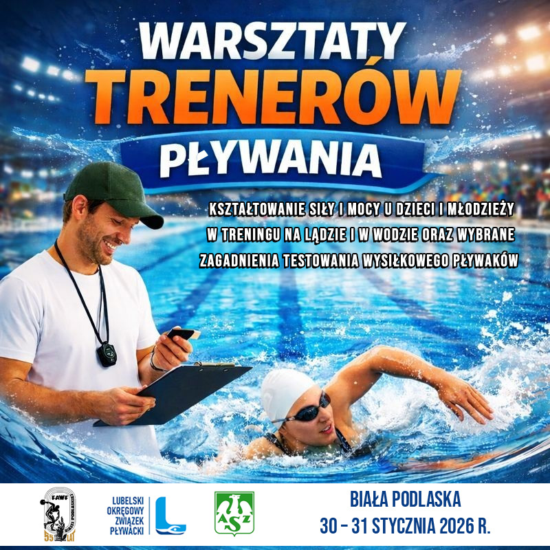 Akademia Wychowania Fizycznego Józefa Piłsudskiego w Warszawie Filia w Białej Podlaskiej, Lubelski Okręgowy Związek Pływacki oraz Klub Sportowy Akademickiego Związku Sportowego w Białej Podlaskiej zapraszają na I WARSZTATY TRENERÓW PŁYWANIA WOJEWÓDZTWA LUBELSKIEGO pt. "Kształtowanie siły i mocy u dzieci i młodzieży w treningu na lądzie i w wodzie oraz wybrane zagadnienia testowania wysiłkowego pływaków", które odbędą się w dniach 30-31 stycznia 2026 roku w Białej Podlaskiej.